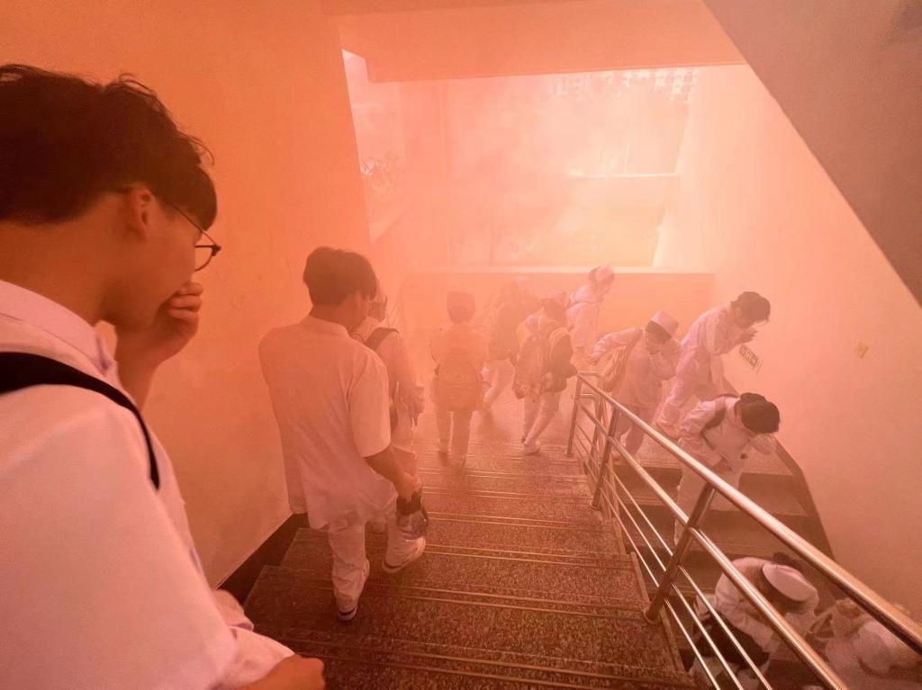 第二部分,應(yīng)急逃生演練(消防、地震)。演練開啟前為參演同學(xué)介紹演練程序、疏散信號(hào)、疏散路線、疏散順序等注意事項(xiàng),并強(qiáng)調(diào)在疏散過程中切勿擁擠、推搡導(dǎo)致踩踏事件發(fā)生。演練工作組接到演練指令后,模擬燃放煙霧,迅速開啟實(shí)訓(xùn)室的安全出口大門,組織學(xué)生依次從實(shí)訓(xùn)室撤出,按照指定路線,分別有序從樓梯通道內(nèi)側(cè)撤離,彎腰、捂口鼻、無人喧嘩、迅速有序地撤出實(shí)訓(xùn)室,到空曠位置集合并清點(diǎn)人數(shù)。