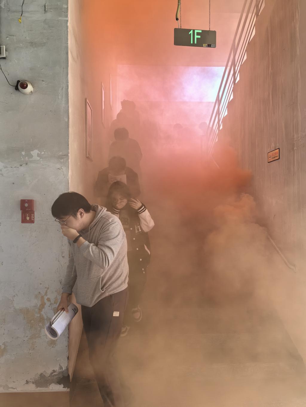 第二部分應(yīng)急逃生演練(消防、地震)。演練開啟前安全工作處林澤文先詳細(xì)介紹消防器材的使用、演練程序、疏散信號、疏散路線、疏散順序等注意事項,并強(qiáng)調(diào)在疏散過程中切勿擁擠、推搡導(dǎo)致踩踏事件發(fā)生。演練工作組接到演練指令后,燃放煙霧,平靜的醫(yī)工學(xué)院樓突然黃煙四起、警報鈴響,各位老師迅速到達(dá)指定崗位,學(xué)生們也隨之做出反應(yīng),在現(xiàn)場人員的指揮下,學(xué)生們紛紛用手、濕紙巾等捂住口鼻,彎著腰從預(yù)定的逃生路線進(jìn)行撤離,撤退中所有同學(xué)緊靠右行,撤退過程井然有序,參加本次演練師生全部安全撤離到指定區(qū)域。