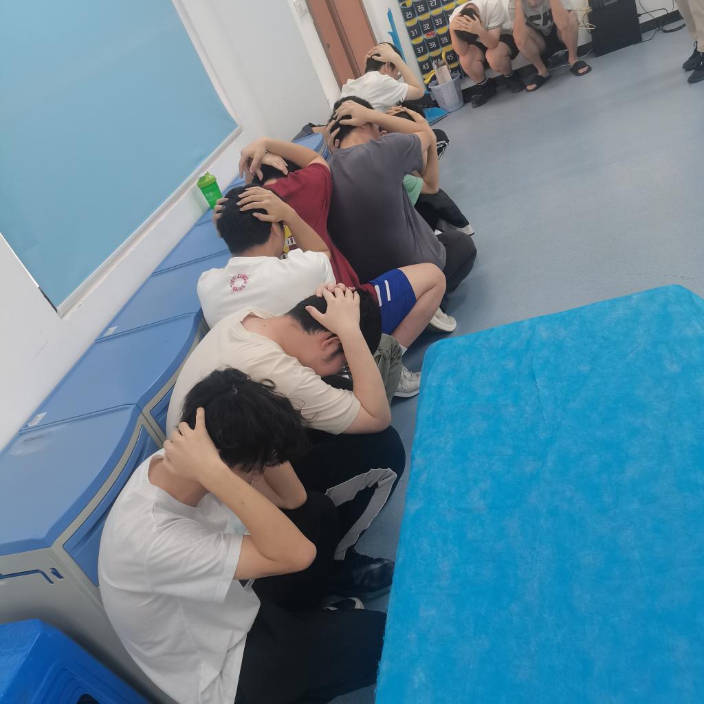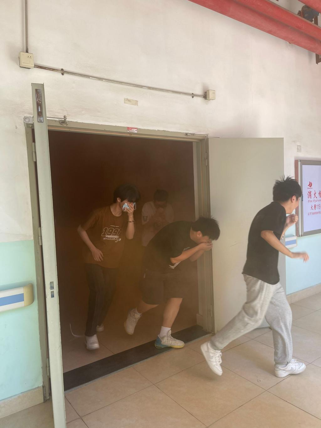 二是應(yīng)急逃生演練(消防、地震)。安全工作處林澤文老師詳細(xì)介紹消防器材使用、疏散信號、疏散路線、疏散順序等注意事項,并強調(diào)在疏散過程中切勿擁擠、推搡導(dǎo)致踩踏事件發(fā)生。演練工作組接到演練指令后,燃放煙霧,迅速開啟實訓(xùn)室的安全出口大門,組織學(xué)生彎腰、捂口鼻、無人喧嘩、迅速有序地撤出實訓(xùn)室,按照指定路線,從樓梯通道內(nèi)側(cè)撤離,到空曠位置集合并清點人數(shù)。