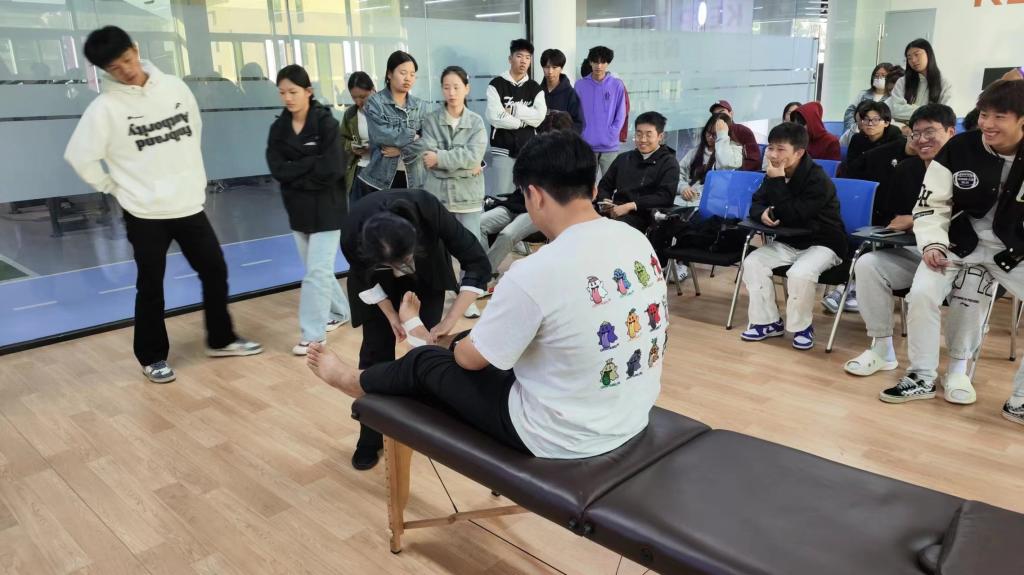 本次演練分為運(yùn)動損傷處理演練和應(yīng)急逃生演練(消防、地震)兩個(gè)部分。運(yùn)動損傷處理處理演練由健康學(xué)院溫曉黛老師、魏涵銳老師現(xiàn)場講授運(yùn)動損傷的應(yīng)急處理流程,并現(xiàn)場進(jìn)行模擬處置。