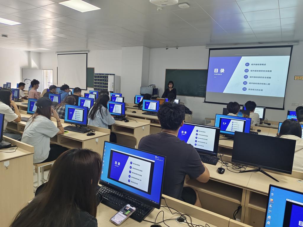 為保證演練活動安全、有序進行,工作人員事先進行周密安排,制定演練方案。本次演練分兩個部分進行。第一部分,磁共振MRI檢查安全演練。首先由醫(yī)學(xué)技術(shù)與工程學(xué)院吳沁老師集中講授實訓(xùn)過程中磁共振MRI檢查安全、處理流程及預(yù)防措施。告知學(xué)生發(fā)生MRI檢查意外不要驚慌,聽從指揮,完成應(yīng)急處理流程。工作人員維持現(xiàn)場秩序,確保實訓(xùn)室無發(fā)生其他安全事件。