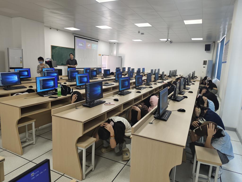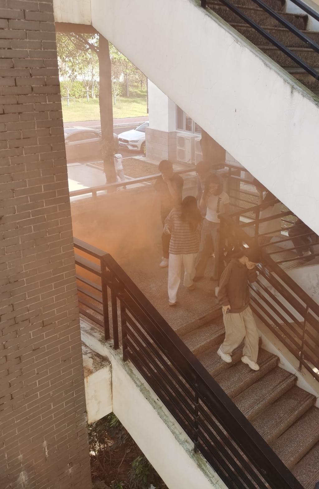 第二部分應(yīng)急逃生演練(消防、地震)。演練開啟前安全工作處林澤文先詳細介紹消防器材的使用、演練程序、疏散信號、疏散路線、疏散順序等注意事項,并強調(diào)在疏散過程中切勿擁擠、推搡導(dǎo)致踩踏事件發(fā)生。演練工作組接到演練指令后,燃放煙霧,平靜的醫(yī)工學(xué)院樓突然黃煙四起、警報鈴響,各位老師迅速到達指定崗位,學(xué)生們也隨之做出反應(yīng),在現(xiàn)場人員的指揮下,學(xué)生們紛紛用手、濕紙巾等捂住口鼻,彎著腰從預(yù)定的逃生路線進行撤離,撤退中所有同學(xué)緊靠右行,撤退過程井然有序,參加本次演練師生全部安全撤離到指定區(qū)域。