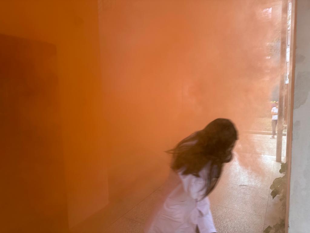 第二部分應(yīng)急逃生演練(消防、地震)。演練開啟前安全工作處林澤文先詳細(xì)介紹消防器材的使用、演練程序、疏散信號、疏散路線、疏散順序等注意事項,并強(qiáng)調(diào)在疏散過程中切勿擁擠、推搡導(dǎo)致踩踏事件發(fā)生。各位置工作人員提前到崗,認(rèn)真履責(zé),確保撤離安全有序。演練開始,安全工作處演練工作組接到演練指令后,模擬燃放煙霧,工作人員組織學(xué)生依次從實訓(xùn)(驗)室撤出,按照指定路線,分別有序從樓梯通道內(nèi)側(cè)撤離,做到彎腰、捂口鼻、迅速有序,到一層大廳集合并清點(diǎn)人數(shù)。