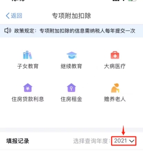 第二步:選擇扣除年度“2021”,再選擇需要填寫或修改的專項附加扣除。