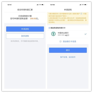 (七)以上所有數(shù)據(jù)確認無誤后,點“下一步”,完成稅款計算,可查看退稅金額,點擊“申請退稅”,并選擇退稅銀行卡。