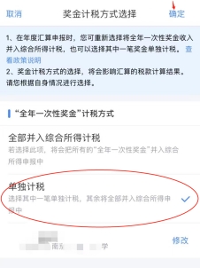 點擊“工資薪金”-“全年一次性獎金”計稅方式有“全部并入綜合所得計稅”和“單獨計稅”兩種,可以分別試算,選最優(yōu)方式。