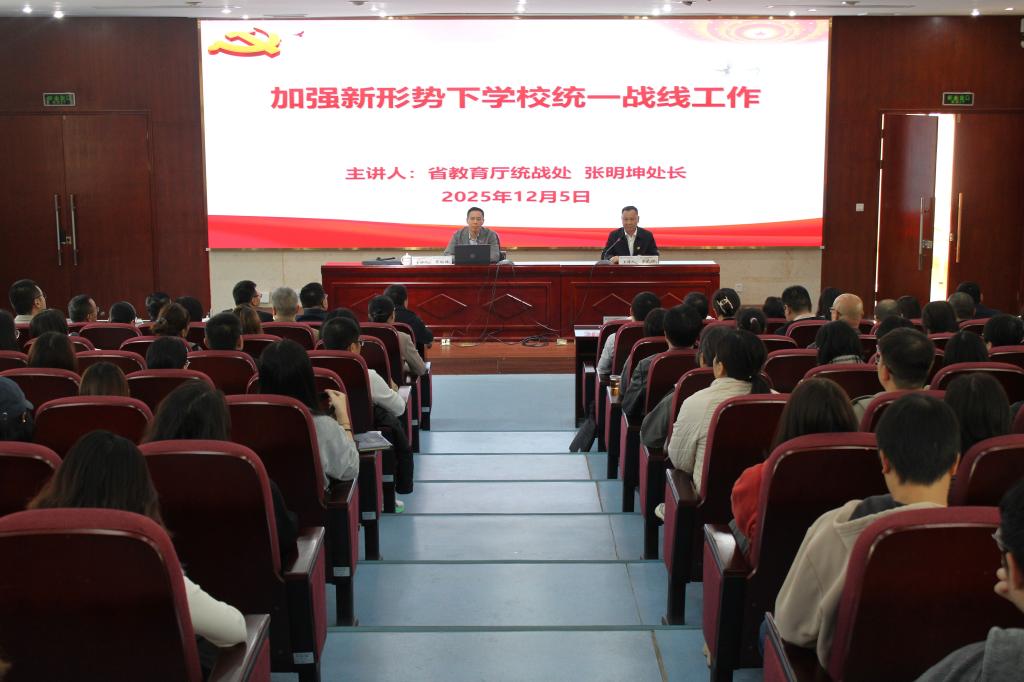 為深入學習領會黨的二十屆四中全會精神,進一步提升統(tǒng)一戰(zhàn)線工作隊伍的政治站位和理論水平,12月5日,我校聯(lián)合中共閩侯縣委統(tǒng)戰(zhàn)部(民宗局)、福建藝術職業(yè)學院、福州英華職業(yè)學院、大中小思政一體化建設聯(lián)盟等12家單位共同舉辦“加強新形勢下學校統(tǒng)一戰(zhàn)線工作”專題培訓會。本次培訓特邀省教育廳統(tǒng)戰(zhàn)處處長張明坤授課,旨在深化思想認識、凝聚實踐合力,推動新時代統(tǒng)一戰(zhàn)線工作高質量發(fā)展。講座由我校黨委書記曾武祈主持。