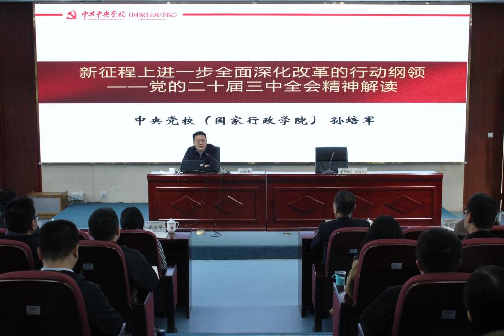 黨的二十屆三中全會(huì)是我們黨的歷史上又一個(gè)重要里程碑,是進(jìn)一步全面深化改革、推進(jìn)中國(guó)式現(xiàn)代化的總動(dòng)員、總部署,深刻回答了在新的歷史條件下舉什么旗、走什么路、改什么、為誰改、怎么改等重大問題,在黨和國(guó)家發(fā)展進(jìn)程中具有極其重大和深遠(yuǎn)的歷史意義。為進(jìn)一步學(xué)習(xí)貫徹落實(shí)黨的二十屆三中全會(huì)精神,完整、準(zhǔn)確、全面理解《決定》的重大意義、措施要求,切實(shí)把全會(huì)精神轉(zhuǎn)化為干事創(chuàng)業(yè)的精氣神、改革創(chuàng)新的源動(dòng)力,促進(jìn)學(xué)校高質(zhì)量發(fā)展。12月13日,校黨委理論學(xué)習(xí)中心組舉行擴(kuò)大會(huì)議,邀請(qǐng)中央黨校孫培軍教授為我們作《新征程上進(jìn)一步全面深化改革的行動(dòng)綱領(lǐng)——黨的二十屆三中全會(huì)精神解讀》專題輔導(dǎo)報(bào)告。會(huì)議由校黨委書記曾武祈主持,校領(lǐng)導(dǎo)、副科級(jí)以上干部、支部書記、專職組織員、馬克思主義學(xué)院全體教師及團(tuán)學(xué)骨干代表共同參加會(huì)議。