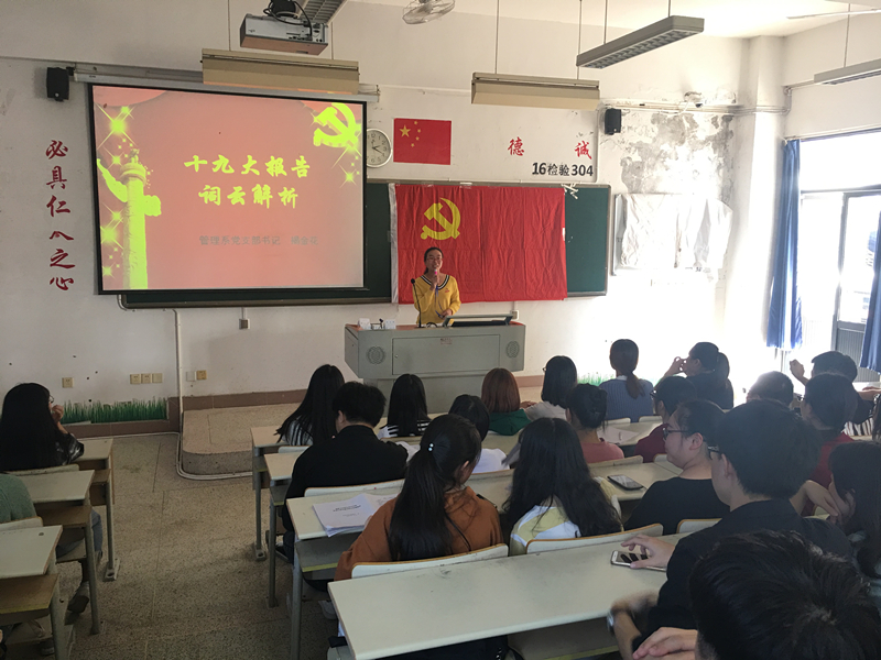 11月9日下午,黨總支組織委員、學(xué)生黨支部書記揭金花在教學(xué)樓314教為管理系第三期業(yè)余分黨校學(xué)員們講授了題為《十九大詞云解析》的第一課。