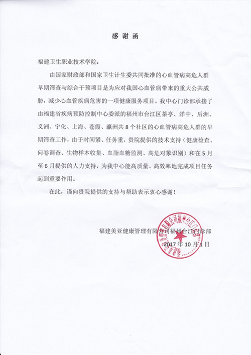 近日,福建美亞健康管理有限公司福州臺(tái)江門(mén)診部向我系發(fā)來(lái)感謝函,對(duì)我系在《心血管病高危人群早期篩查與綜合干預(yù)項(xiàng)目》臺(tái)江調(diào)查點(diǎn)提供的專業(yè)技術(shù)服務(wù)表示衷心感謝。