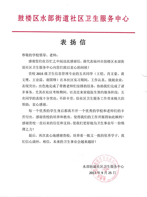 近日,管理系收到實習單位水部街道社區(qū)衛(wèi)生服務中心發(fā)來的表揚信。