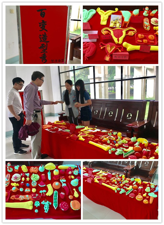 為迎接學(xué)院105周年校慶紀(jì)念日,管理系同學(xué)在聶小鳳和揭金花老師的指導(dǎo)下,結(jié)合自己專業(yè)特色用橡皮泥捏出不一樣的造型。首先展示的是各種的子宮模型,畸形子宮、縱膈子宮、雙角子宮等;作為專業(yè)主場,預(yù)防醫(yī)學(xué)專業(yè)展示了心、肝、肺、胃、胰腺、大腸、手骨、股骨等模型,讓我們對人體內(nèi)臟有了更為直觀的感受;而體育保健、營養(yǎng)專業(yè)的同學(xué)也不示弱,南瓜,豆角、玉米、楊桃、葡萄、甚至漢堡也上線,他們堅(jiān)信更好的膳食、更強(qiáng)壯的體魄才能有更好的健康。作為管理系獨(dú)具特色的醫(yī)學(xué)美容技術(shù)專業(yè)和衛(wèi)生信息管理專業(yè),除了通過畢業(yè)成果設(shè)計(jì)展和電腦維修服務(wù)來為自己加分,他們也參與到其中,精致的晚禮服、手工版SKII和呆萌的卡通都是他們對美的感悟。