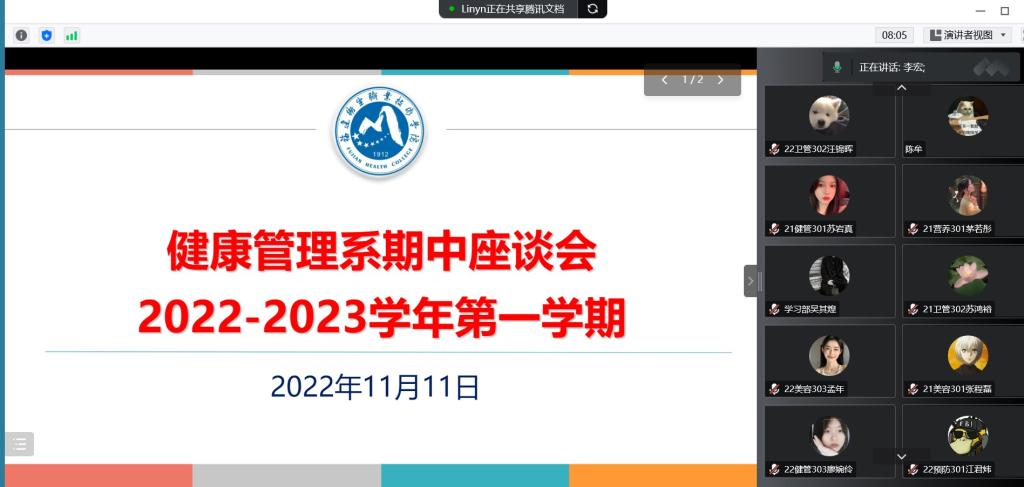 為了解我系師生在校的學習生活狀況以及遇到的實際問題,充分落實以學生為本、全面發(fā)展的理念,2022年11月11日中午12時40分,健康管理系通過線上騰訊會議形式召開了2022-2023學年第一學期期中教學座談會,參與本次會議活動的有校督導李冬秀老師、何旭春老師,健康管理系副主任李宏老師、各教研室教師以及各班學生代表。