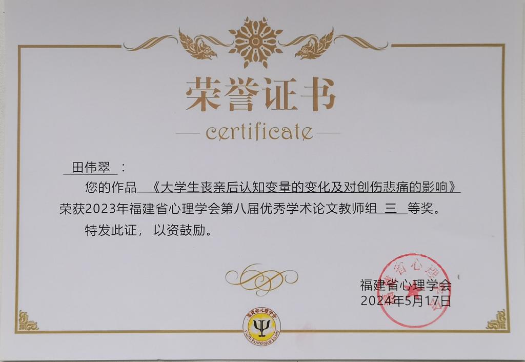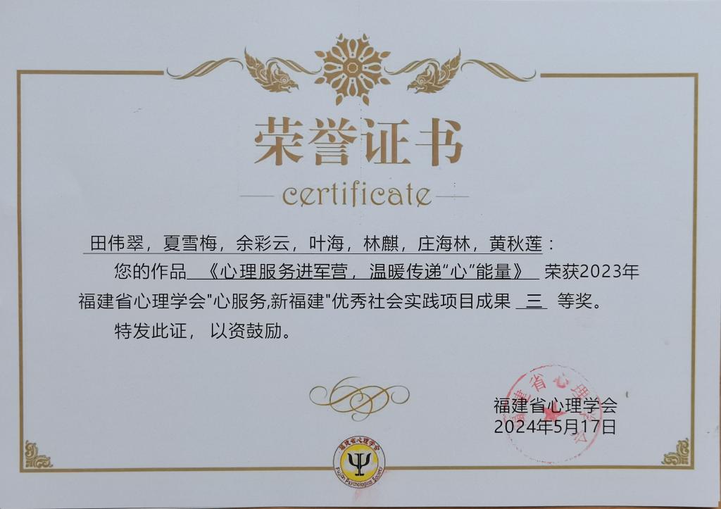 近日,福建省心理學(xué)會關(guān)于2023年“心服務(wù),新福建”優(yōu)秀社會實(shí)踐項(xiàng)目成果和第八屆優(yōu)秀學(xué)術(shù)論文評選落下帷幕。經(jīng)福建省心理學(xué)會理事專家評審、常務(wù)理事會和理事會審議,我校公共衛(wèi)生與健康管理學(xué)院報(bào)送的社會實(shí)踐項(xiàng)目成果《心理服務(wù)進(jìn)軍營,溫暖傳遞“心”能量》榮獲優(yōu)秀社會實(shí)踐項(xiàng)目成果三等獎(jiǎng);田偉翠老師報(bào)送的學(xué)術(shù)論文《大學(xué)生喪親后認(rèn)知變量的變化及對創(chuàng)傷悲痛的影響》榮獲第八屆優(yōu)秀學(xué)術(shù)論文教師組三等獎(jiǎng)。