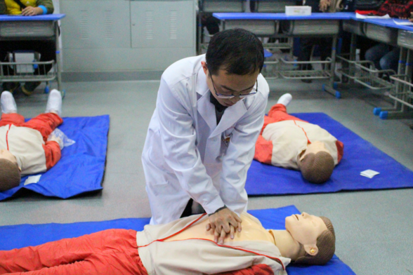 活動(dòng)在王國(guó)浩老師與參訓(xùn)教師的互動(dòng)交流中拉開(kāi)了序幕。在了解各位教師急救技能掌握程度的基礎(chǔ)上,管理系第二黨支部組織委員、醫(yī)學(xué)營(yíng)養(yǎng)教研室王國(guó)浩老師用人體模型為大家詳細(xì)講解心肺復(fù)蘇(CPR)的整體操作流程,并親自演示如何檢查呼吸、如何定位按壓、如何打開(kāi)病人氣道、如何進(jìn)行人工呼吸等環(huán)節(jié),在實(shí)踐中糾正常見(jiàn)動(dòng)作偏差和錯(cuò)誤。同時(shí)鼓動(dòng)教師們積極實(shí)踐操練,規(guī)范動(dòng)作要領(lǐng),做到急救方法快捷準(zhǔn)確,讓急救技能在實(shí)踐操練中更加深化入腦入心。