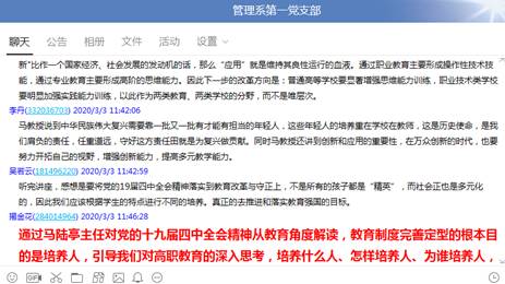 馬主任在解讀文件的基礎(chǔ)上,增加了自己的見解,形象生動的為我們上了一堂課,使我們受益匪淺。觀看完講座后,支部黨員積極發(fā)言,在線討論,發(fā)表觀后感。管理系第一黨支部副書記揭金花老師表示通過馬陸亭主任對黨的十九屆四中全會精神從教育角度解讀,教育制度完善定型的根本目的是培養(yǎng)人,引導(dǎo)我們對高職教育的深入思考,培養(yǎng)什么人、怎樣培養(yǎng)人、為誰培養(yǎng)人,在具體的教育教學(xué)活動中更要注重素質(zhì)教育,特別重視學(xué)生的社會責(zé)任感、創(chuàng)新精神和實踐能力培養(yǎng)。立德樹人是綜合概念,是根本任務(wù),以德為先,能力為重,培養(yǎng)德智體美勞全面發(fā)展的人才,為人民服務(wù)。德育作為醫(yī)學(xué)人才培養(yǎng)的首要內(nèi)容,將思想政治教育和醫(yī)學(xué)職業(yè)素養(yǎng)教育貫穿人才培養(yǎng)全過程,更要以此次疫情防控斗爭中廣大醫(yī)務(wù)工作者為榜樣教育學(xué)生,著力培養(yǎng)學(xué)生“珍愛生命、大醫(yī)精誠”的救死扶傷精神,引導(dǎo)學(xué)生將預(yù)防疾病、解除病痛和維護群眾健康作為自己的神圣職責(zé)。能力為重培養(yǎng)具有仁術(shù)的醫(yī)學(xué)人才。要把醫(yī)學(xué)生崗位勝任能力培養(yǎng)作為改革重點,以高水平的臨床實踐體系建設(shè)促進醫(yī)學(xué)生在實踐中練就過硬本領(lǐng)。溫曉黛老師表示教育制度的改革不是一蹴而就的,要有步驟有計劃,根據(jù)學(xué)生特點,逐步過度,將職業(yè)教育發(fā)展成符合時代特色的,實踐性強的,真正為國家培養(yǎng)職業(yè)人才。李芳琴老師表示我們要采取多種教育方式,不能用一種教育規(guī)律代替一切,要擺脫單純的知識點學(xué)習(xí),加強技能和思維訓(xùn)練,尤其是醫(yī)學(xué)院校的高等職業(yè)教育,要充分利用教育制度的優(yōu)勢特征,發(fā)展職業(yè)教育。