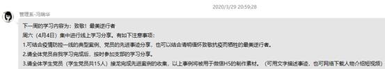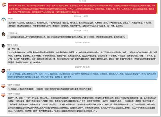 自主學(xué)習(xí)后,馮瑞華同志在支部QQ群中組織支部黨員圍繞學(xué)習(xí)內(nèi)容紛紛發(fā)表學(xué)習(xí)感想。馮瑞華同志表示不能忘記戰(zhàn)“疫”英雄的奉獻和犧牲,以清明節(jié)為契機,重溫戰(zhàn)“疫”英雄的先進事跡,感悟其背后的奉獻精神和愛國情懷,用實際行動向戰(zhàn)“疫”英雄致敬。張眉芳同志表示英雄的祖國,英雄的人民,書寫了人類歷史上可歌可泣的抗疫篇章,慎終追遠,在清明這一特殊時期,即寄托著血濃于水的同胞之情,也昭示著慨然前行的奮發(fā)之志。王國浩同志表示犧牲在第一線的醫(yī)務(wù)工作者,警察,輔警及志愿者們,用自己的實際行動詮釋了社會主義建設(shè)者的責(zé)任和擔(dān)當,他們的先進事跡不會被歷史所以往,必將激勵更多的人為抗擊疫情奉獻自我。