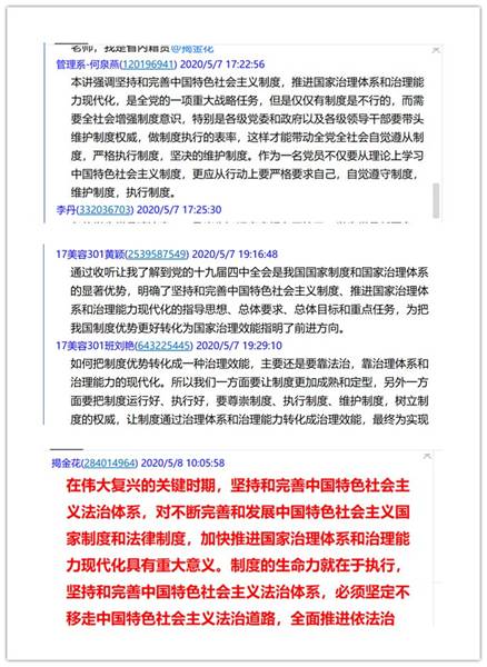 理論學(xué)習(xí)后,同志們在線交流了學(xué)習(xí)體會。管理系第一黨支部副書記揭金花表示,在偉大復(fù)興的關(guān)鍵時期,堅持和完善中國特色社會主義法治體系,對不斷完善和發(fā)展中國特色社會主義國家制度和法律制度,加快推進(jìn)國家治理體系和治理能力現(xiàn)代化具有重大意義。制度的生命力就在于執(zhí)行,堅持和完善中國特色社會主義法治體系,必須堅定不移走中國特色社會主義法治道路,全面推進(jìn)依法治國,堅持依法治國、依法執(zhí)政、依法行政共同推進(jìn),堅持法治國家、法治政府、法治社會一體建設(shè),全面推進(jìn)科學(xué)立法、嚴(yán)格執(zhí)法、公正司法、全民守法。黨員特別是干部要帶頭尊法學(xué)法守法用法,提高運用法治思維和法治方式解決問題的能力,充分發(fā)揮“關(guān)鍵少數(shù)”的表率作用。黨員何泉燕表示,本講強調(diào)堅持和完善中國特色社會主義制度,推進(jìn)國家治理體系和治理能力現(xiàn)代化,是全黨的一項重大戰(zhàn)略任務(wù),但是僅僅有制度是不行的,而需要全社會增強制度意識,特別是各級黨委和政府以及各級領(lǐng)導(dǎo)干部要帶頭維護(hù)制度權(quán)威,做制度執(zhí)行的表率,這樣才能帶動全黨全社會自覺遵從制度,嚴(yán)格執(zhí)行制度,堅決的維護(hù)制度。作為一名黨員不僅要從理論上學(xué)習(xí)中國特色社會主義制度,更應(yīng)從行動上要嚴(yán)格要求自己,自覺遵守制度,維護(hù)制度,執(zhí)行制度。預(yù)備黨員劉艷同學(xué)表示,如何把制度優(yōu)勢轉(zhuǎn)化成一種治理效能,主要還是要靠法治,靠治理體系和治理能力的現(xiàn)代化。所以我們一方面要讓制度更加成熟和定型,另外一方面要把制度運行好、執(zhí)行好,要尊崇制度、執(zhí)行制度、維護(hù)制度,樹立制度的權(quán)威,讓制度通過治理體系和治理能力轉(zhuǎn)化成治理效能,最終為實現(xiàn)建設(shè)現(xiàn)代化法治強國做出努力。