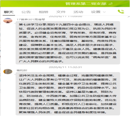 6月11日,管理系第二黨支部借助學習強國平臺學習了十九屆四中全會精神——中國制度十三講中的第七講:堅持和完善統(tǒng)籌城鄉(xiāng)的民生保障制度,滿足人民日益增長的美好生活需要。黨的十九屆四中全會提出,必須健全幼有所育、學有所教、勞有所得、病有所醫(yī)、老有所養(yǎng)、住有所居、弱有所扶等方面國家基本公共服務制度體系,注重加強普惠性、基礎性、兜底性民生建設,保障群眾基本生活,滿足人民多層次多樣化需求,使改革發(fā)展成果更多更公平惠及全體人民。