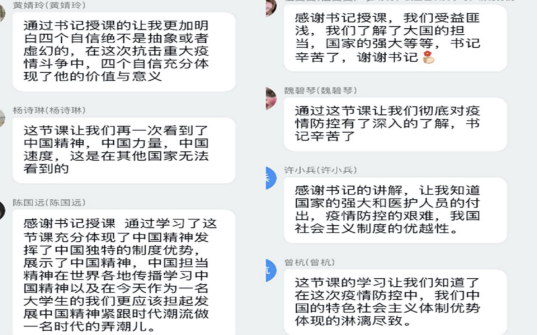 制度是根本,以人民為中心。黃曦書記帶領(lǐng)同學們一起回顧了國內(nèi)外疫情發(fā)展及其應(yīng)對處理方式,詳細講解了在疫情防控期間,是中國共產(chǎn)黨的堅強領(lǐng)導(dǎo)和社會主義制度集中力量辦大事的優(yōu)越性,使得我國能夠盡快控制疫情蔓延勢頭、阻斷病毒本土傳播、取得武漢保衛(wèi)戰(zhàn)和湖北保衛(wèi)戰(zhàn)的決定性成果,用實際行動捍衛(wèi)了人民群眾的生命安全和身體健康。