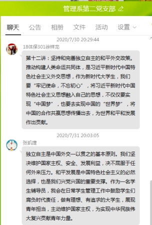 2020年7月30日,管理系第二黨支部借助學(xué)習(xí)強(qiáng)國平臺學(xué)習(xí)了“治國理政大家讀”系列第十二講:堅持和完善獨(dú)立自主的和平外交政策。黨的十九屆四中全會提出,要堅持和完善獨(dú)立自主的和平外交政策,推動構(gòu)建人類命運(yùn)共同體。新中國成立后確立了獨(dú)立自主的和平外交政策,倡導(dǎo)和平共處五項原則,打破了“國強(qiáng)必霸”、“大國必戰(zhàn)”的西方邏輯。而推動構(gòu)建人類命運(yùn)共同體則是在人類歷史發(fā)展進(jìn)程的新高度上,中國外交的重要目標(biāo)和努力方向。提出必須統(tǒng)籌國內(nèi)國際兩個大局,高舉和平、發(fā)展、合作、共贏旗幟,堅定不移維護(hù)國家主權(quán)、安全、發(fā)展利益,堅定不移維護(hù)世界和平、促進(jìn)共同發(fā)展。