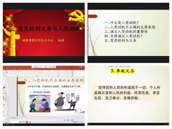 2021年2月21日,健康管理系分黨校在線上開展《黨員權(quán)利義務(wù)與入黨動機》專題黨課,此次課程由團總書記趙茜老師為全體學(xué)員進行培訓(xùn)。趙茜老師圍繞以下五個內(nèi)容:(1)什么是入黨動機;(2)入黨動機不正確的主要表現(xiàn);(3)端正入黨動機的重要性;(4)怎樣端正入黨動機;(5)黨員權(quán)利與義務(wù)展開本節(jié)課主要內(nèi)容。