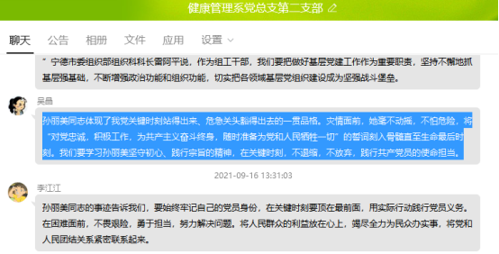大家紛紛表示,這次活動(dòng)讓自己深受感動(dòng),深受教育,孫麗美同志始終把對(duì)黨忠誠、人民至上融入到精神血脈中,用生命詮釋了共產(chǎn)黨人甘于犧牲奉獻(xiàn)的崇高品格。今后要以孫麗美同志為榜樣,把學(xué)習(xí)成效轉(zhuǎn)化為實(shí)際行動(dòng)。