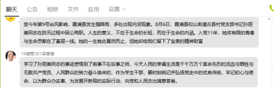 教師黨員吳晶表示,孫麗美同志身上體現(xiàn)了我黨關(guān)鍵時(shí)刻站得出來、危急關(guān)頭豁得出去的一貫品格。災(zāi)情面前,她毫不動(dòng)搖,不怕危險(xiǎn),將“對(duì)黨忠誠,積極工作,為共產(chǎn)主義奮斗終身,隨時(shí)準(zhǔn)備為黨和人民犧牲一切”的誓詞刻入骨髓直至生命最后時(shí)刻。我們要學(xué)習(xí)孫麗美堅(jiān)守初心、踐行宗旨的精神,在關(guān)鍵時(shí)刻,不退縮,不放棄,踐行共產(chǎn)黨員的使命擔(dān)當(dāng)。