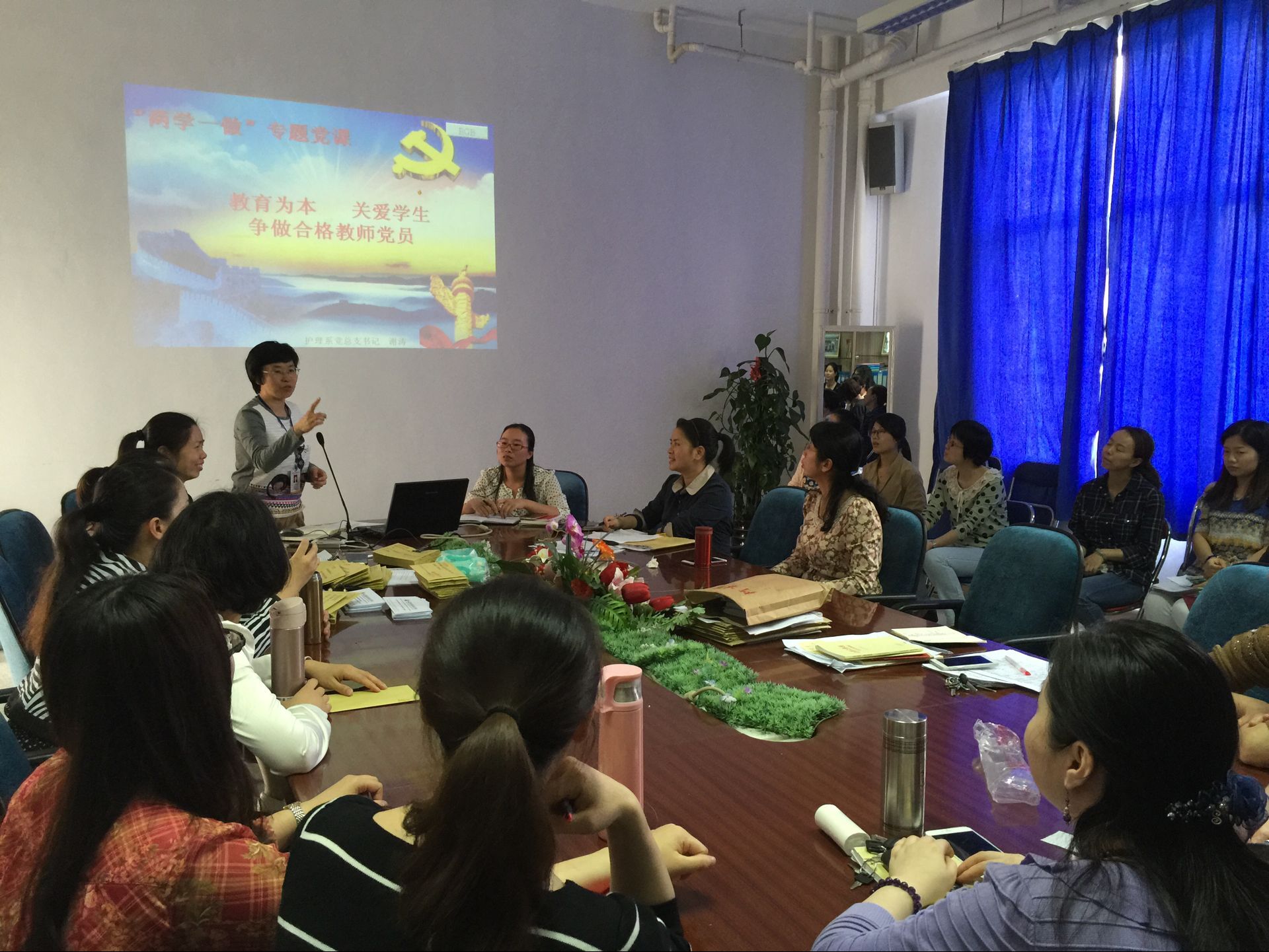 2016年5月17日下午,護(hù)理系黨總支開展了“兩學(xué)一做”學(xué)習(xí)專題黨課??傊浿x濤授課,以“‘教育為本,關(guān)愛學(xué)生;爭(zhēng)做合格教師黨員’——學(xué)生的心理問題識(shí)別和干預(yù)”為主題,對(duì)全系教師黨員進(jìn)行了專題教育輔導(dǎo)。