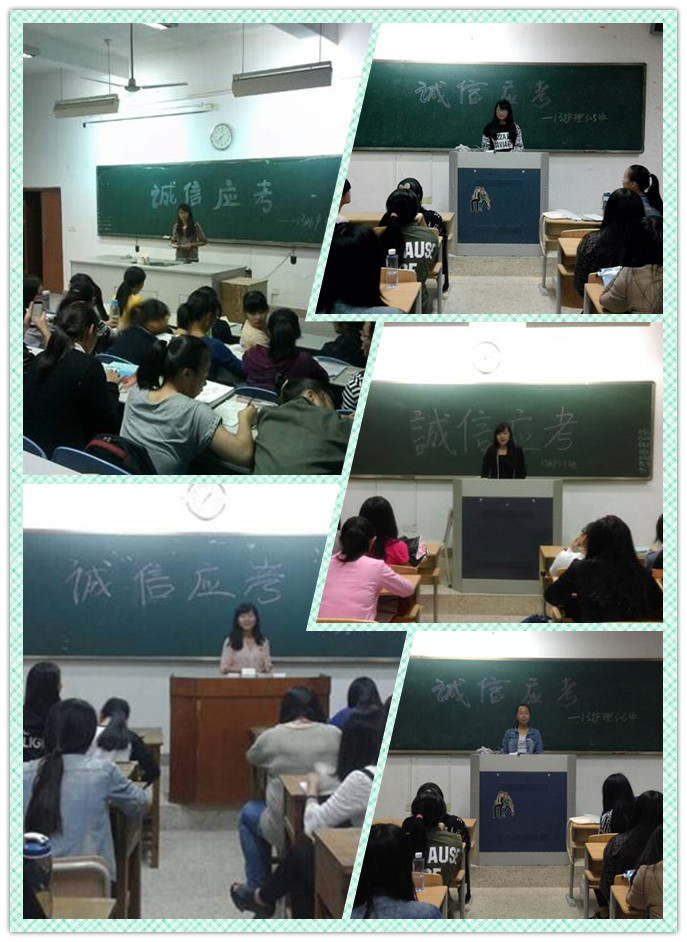 每個(gè)班級(jí)都宣讀了誠(chéng)信應(yīng)考倡議書(shū),由學(xué)習(xí)委員組織學(xué)習(xí)《學(xué)生違紀(jì)處理規(guī)定》中有關(guān)考試紀(jì)律規(guī)定、考試違紀(jì)作弊行為的認(rèn)定,讓同學(xué)銘記考試規(guī)章制度,嚴(yán)格要求自己。輔導(dǎo)員強(qiáng)調(diào)了遵守考試紀(jì)律的重要性及其處分結(jié)果的嚴(yán)重性。班會(huì)結(jié)束后,各個(gè)班級(jí)都組織學(xué)生進(jìn)行承諾誠(chéng)信應(yīng)考簽名活動(dòng),通過(guò)簽名表明自己誠(chéng)信應(yīng)考的決心。