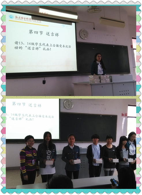 本次活動(dòng)主要分為兩個(gè)環(huán)節(jié)。第一環(huán)節(jié)于10月30日晚6:30在學(xué)術(shù)廳聘請(qǐng)福建農(nóng)林大學(xué)馬克思主義學(xué)院副書記、副院長(zhǎng)劉新玲教授進(jìn)行《公共生活中的道德》講座;第二環(huán)節(jié)分以歌唱《公民道德歌》、朗讀《公民道德三字經(jīng)》、談聆聽(tīng)講座的感悟、送吉祥(發(fā)放小禮品)、行善舉(請(qǐng)同學(xué)們課后在校園里行一個(gè)善舉)這五個(gè)環(huán)節(jié)來(lái)進(jìn)行。