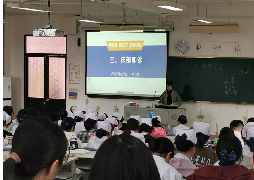為踐行黨的二十大報告提出的建設(shè)高質(zhì)量教育體系和關(guān)注教師隊伍建設(shè),不斷提升青年教師教學水平,展示青年教師的自我風采,護理學院內(nèi)科護理教研室教師林仁琴于4月6日上午開設(shè)了《健康評估》校級公開課,為22級護理專業(yè)學生講授“肺部叩診”內(nèi)容。學校質(zhì)量管理辦公室主任郭禮堅攜校級督導對該堂公開課進行評議、護理學院副院長林浩、王憲寧和各院系多位教師參與聽課。