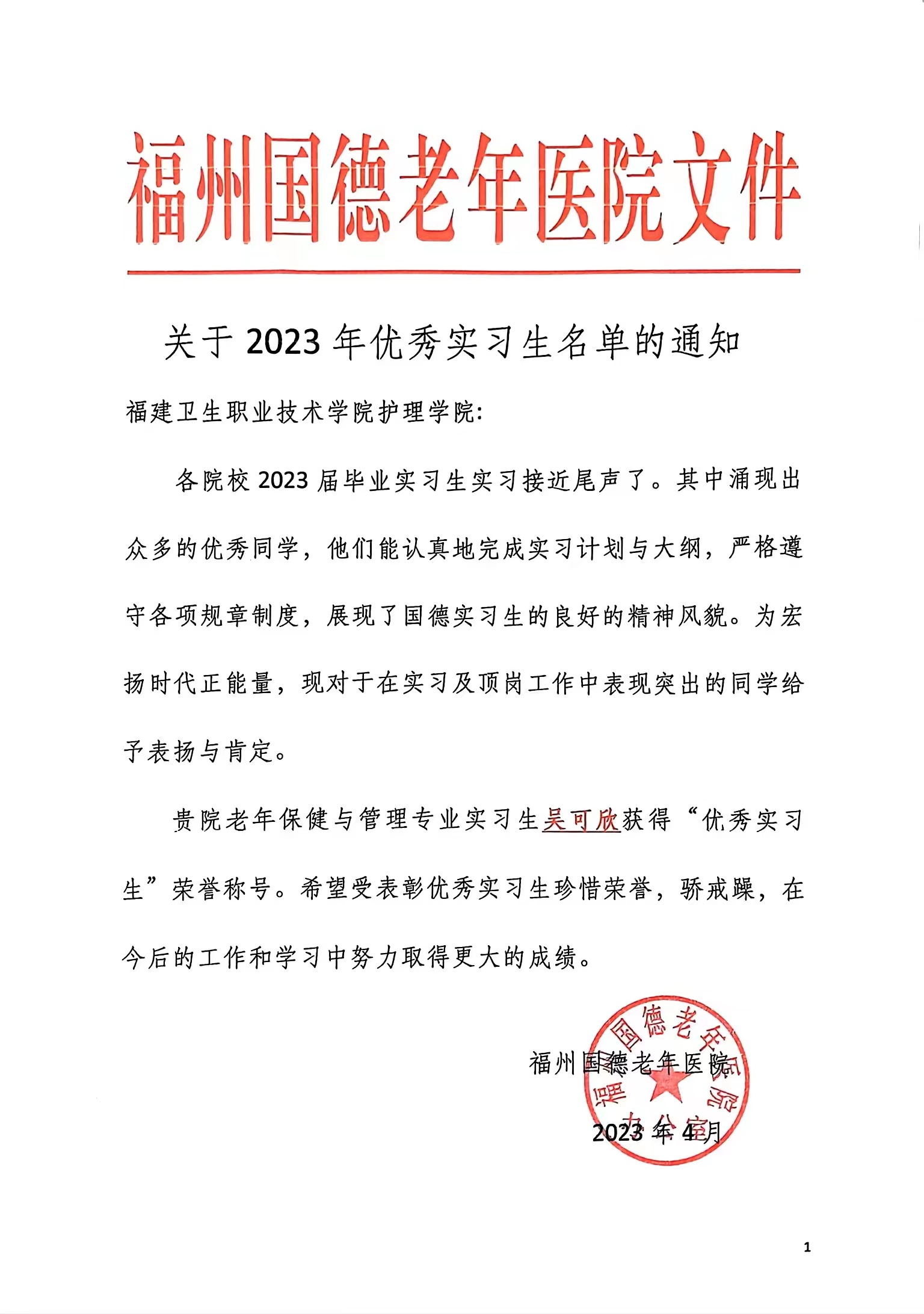 近日,福州國(guó)德老年醫(yī)院公布了一批2023年優(yōu)秀實(shí)習(xí)生名單,我院2020級(jí)老年保健與管理專業(yè)實(shí)習(xí)生吳可欣獲得“優(yōu)秀實(shí)習(xí)生”榮譽(yù)稱號(hào)。
