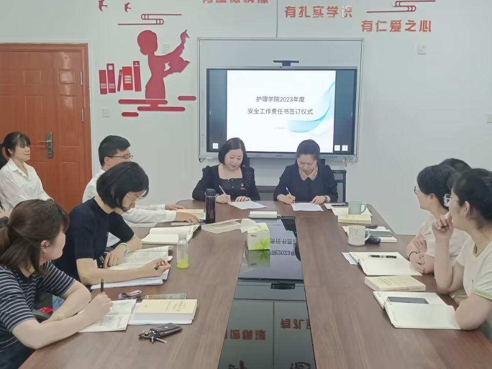最后,龔海蓉與各教研室主任、林來元與各輔導(dǎo)員分別簽訂《護理學(xué)院2023年教研室安全工作責(zé)任書》、《護理學(xué)院2023年學(xué)生安全穩(wěn)定工作責(zé)任書》,做到層層壓實安全責(zé)任,層層傳導(dǎo)工作要求,推動安全責(zé)任落地落實落細。