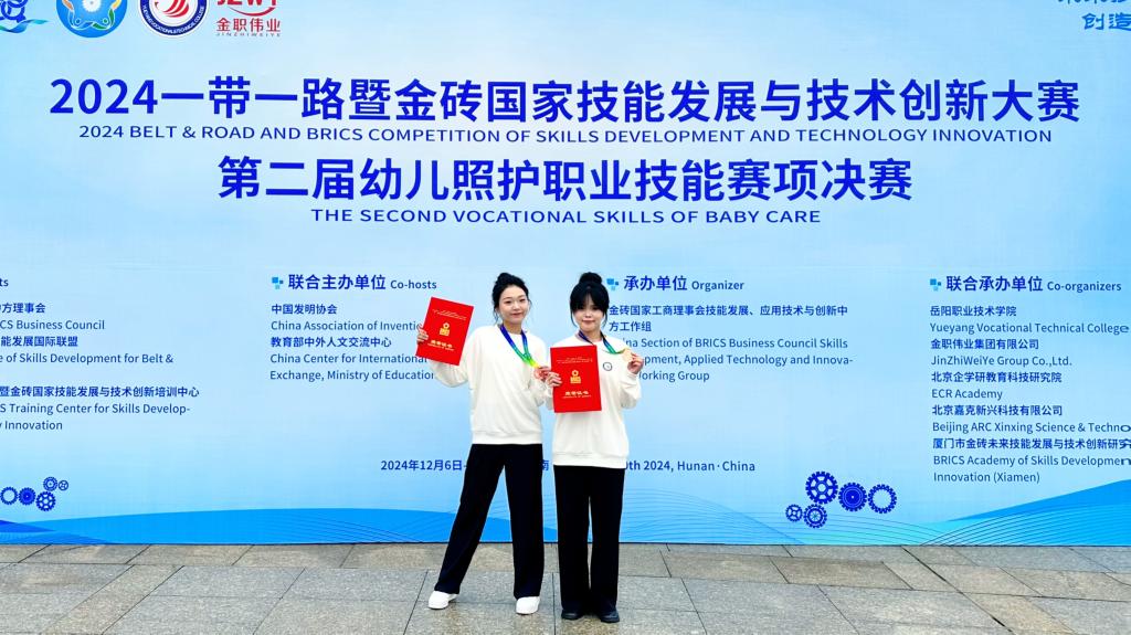 本次大賽由金磚國(guó)家工商理事會(huì)中方理事會(huì)、“一帶一路”暨金磚國(guó)家技能發(fā)展國(guó)際聯(lián)盟、中國(guó)科協(xié)“一帶一路”暨金磚國(guó)家技能發(fā)展與技術(shù)創(chuàng)新培訓(xùn)中心主辦,岳陽(yáng)職業(yè)技術(shù)學(xué)院、金職偉業(yè)集團(tuán)有限公司等聯(lián)合承辦。此前,我校師生參加11月15日至17日在南昌職業(yè)大學(xué)舉辦的2024“一帶一路”“暨金磚國(guó)家技能發(fā)展與技術(shù)創(chuàng)新大賽第二屆幼兒照護(hù)職業(yè)技能賽項(xiàng)區(qū)域選拔賽(第八場(chǎng)),從62支隊(duì)伍、90余名選手中脫穎而出,陳萱萱、梁安宏獲高職組團(tuán)隊(duì)二等獎(jiǎng),李馨老師獲教師組三等獎(jiǎng)。