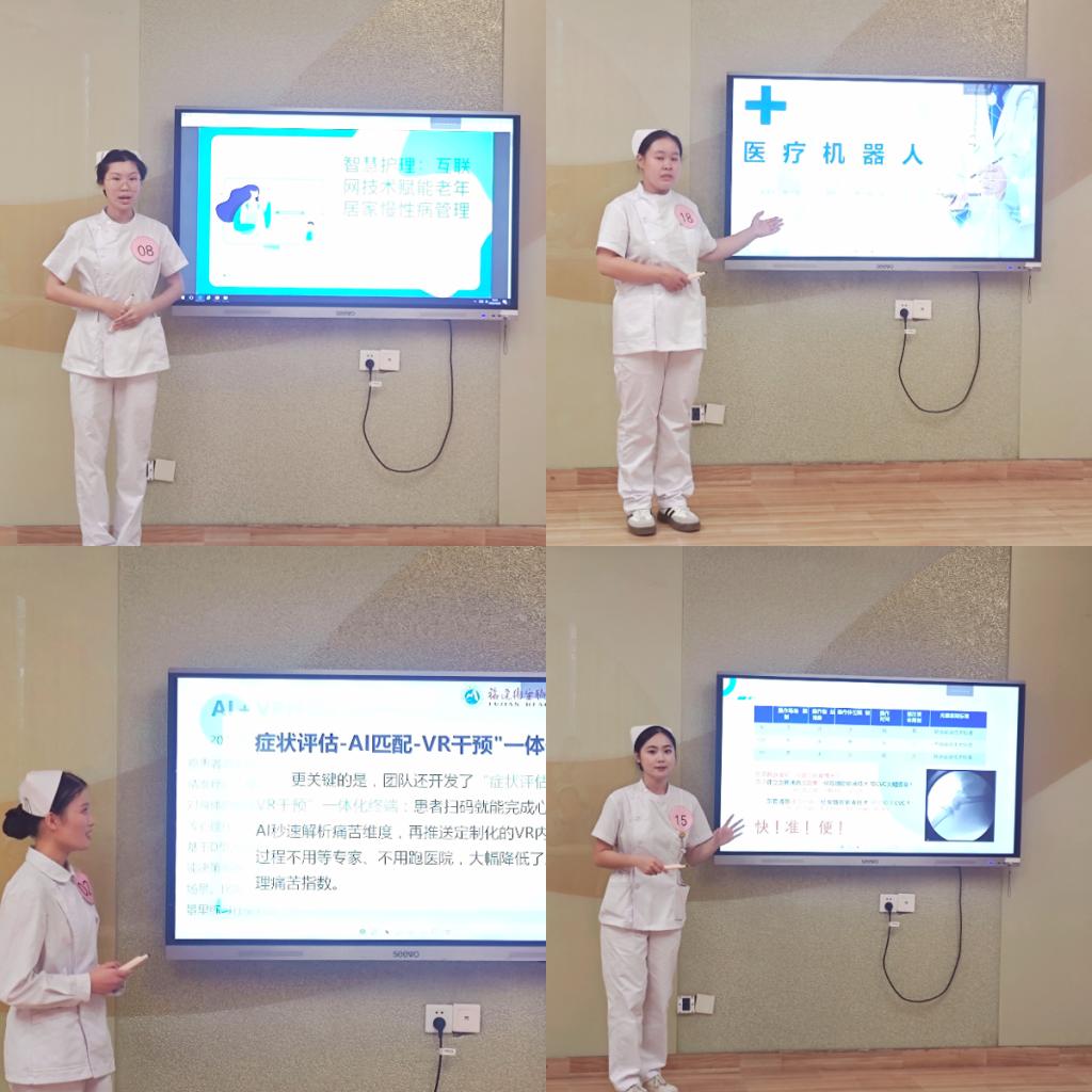 主題匯報(bào)環(huán)節(jié)中,選手們圍繞“VR技術(shù)在護(hù)理實(shí)訓(xùn)中的應(yīng)用”、“AI賦能老年照護(hù)”等自選主題展開闡述,結(jié)合傳統(tǒng)護(hù)理理念與技術(shù)發(fā)展趨勢,展現(xiàn)出良好的學(xué)科交叉意識(shí)與創(chuàng)新思維。匯報(bào)內(nèi)容結(jié)構(gòu)清晰、數(shù)據(jù)詳實(shí),表達(dá)流暢自信,充分體現(xiàn)了我院護(hù)生扎實(shí)的專業(yè)基礎(chǔ)與開闊的職業(yè)視野。