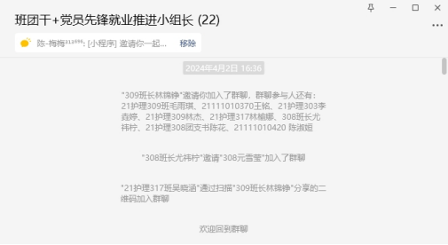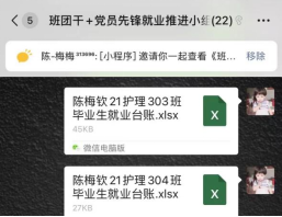 組建先鋒隊(duì)后,各小組長(zhǎng)通過(guò)畢業(yè)生就業(yè)臺(tái)賬“一人一檔”充分了解了各自對(duì)接的畢業(yè)生當(dāng)前的就業(yè)情況和就業(yè)意向,并建立各個(gè)分隊(duì)小組群,針對(duì)學(xué)生的就業(yè)意愿和需求,精準(zhǔn)的幫扶未就業(yè)的同學(xué)。