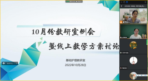 線上教學(xué)開啟前,基礎(chǔ)護(hù)理教研室全體老師在騰訊會議上召開了“互助共享,提高線上實(shí)訓(xùn)教學(xué)有效性”為主題線上教學(xué)方案討論。結(jié)合以往線上實(shí)訓(xùn)教學(xué)存在的問題進(jìn)行交流,大家積極反思,各抒己見,總結(jié)出兩大類問題,分別是:1.實(shí)操課用物場地受限;2.師生互動受影響。老師們?nèi)翰呷毫?,共同研討解決問題的方案,通過靈活調(diào)整教學(xué)進(jìn)度,直播時開啟攝像頭、連麥互動等方式保證教學(xué)效果。