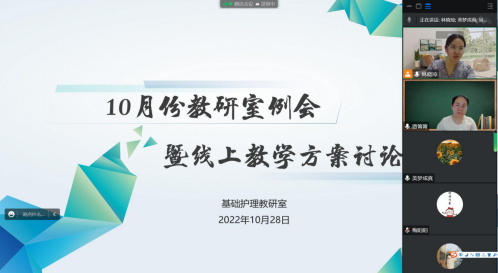 按照校領(lǐng)導(dǎo)的囑托,護(hù)理學(xué)院不斷調(diào)整優(yōu)化線上授課準(zhǔn)備工作,基礎(chǔ)護(hù)理教研室全體老師在騰訊會(huì)議上召開(kāi) “互助共享,提高線上實(shí)訓(xùn)教學(xué)有效性”線上教學(xué)方案討論會(huì)。大家結(jié)合以往線上實(shí)訓(xùn)教學(xué)存在的問(wèn)題進(jìn)行交流、積極反思、各抒己見(jiàn),針對(duì)實(shí)操課用物場(chǎng)地受限和師生互動(dòng)受影響兩大突出問(wèn)題,老師們?nèi)翰呷毫?,共同研討解決問(wèn)題的方案,通過(guò)靈活調(diào)整教學(xué)進(jìn)度,直播時(shí)開(kāi)啟攝像頭、連麥互動(dòng)等方式保證教學(xué)效果。