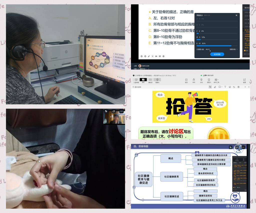 受疫情的影響,學(xué)校暫停線下教學(xué),開(kāi)啟了將近一個(gè)月的線上授課。線上教學(xué)成為護(hù)理學(xué)院師生傳送知識(shí)、交流情感的紐帶。老師們結(jié)合課程特點(diǎn)和線上經(jīng)驗(yàn),積極調(diào)整教學(xué)方式和方法,一方面保證在“沒(méi)有眼神交流”的情況下盡量將知識(shí)點(diǎn)講透,還要輔以練習(xí)確保學(xué)生盡可能地掌握課程內(nèi)容;另一方面,結(jié)合網(wǎng)課的特點(diǎn)合理有效設(shè)計(jì)PPT、互動(dòng)環(huán)節(jié)、休息時(shí)間等,讓網(wǎng)課更加有“現(xiàn)場(chǎng)感”,同時(shí)又讓學(xué)生感受到老師的關(guān)心關(guān)愛(ài),讓網(wǎng)課更加有“溫度”。