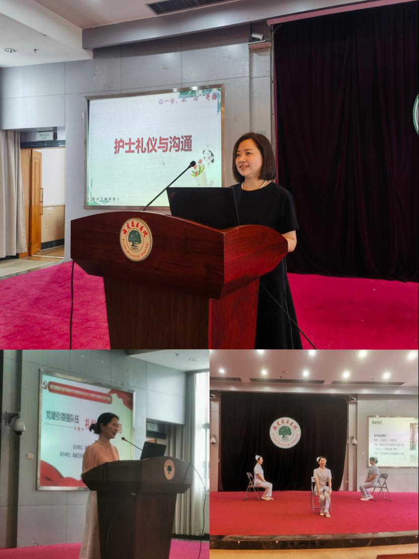 護理學(xué)院第一黨支部書記吳美丹同志以黨史學(xué)習(xí)教育微黨課《禮儀楷模周恩來》正式拉開培訓(xùn)序幕,激勵大家以周恩來總理為榜樣,將文明禮儀內(nèi)化為觀念、外化為行動,做到以心傳禮、以禮待人。隨后,護理學(xué)院第一黨支部第二黨小組組長、人文教研室主任劉菲菲同志開展《護士禮儀與溝通基本要求》專題講座,為新入職護士詳細講解護士儀容禮儀、服飾禮儀、舉止禮儀、護患溝通等職業(yè)禮儀的基本要求。吳美丹同志攜黨員教師賈箐箐、劉偉華同志進行護理禮儀展示并組織大家集中練習(xí)。在培訓(xùn)中,強調(diào)護理禮儀的重要性,護理禮儀是護士工作的基礎(chǔ),直接關(guān)系到患者對醫(yī)院的印象和信任度,通過良好的護理禮儀和溫暖的護理服務(wù),能更好地與患者建立良好的溝通與信任關(guān)系,做到以患者為中心,提高護理質(zhì)量。