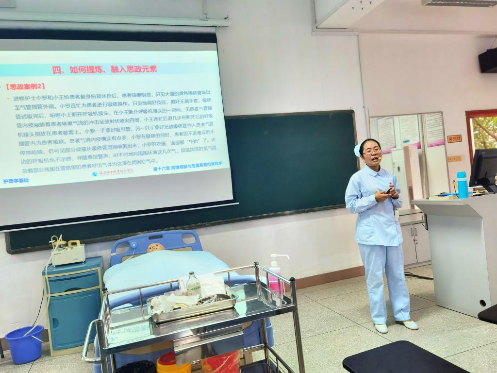 此次活動由賈箐箐老師主講,賈老師闡述了本次集體備課的四個主要內(nèi)容:低氧血癥的分度、如何調(diào)節(jié)吸痰負(fù)壓、吸痰手法及順序、如何提煉并融入思政元素,并且拓展了經(jīng)口鼻吸痰的禁忌癥和并發(fā)癥的內(nèi)容。