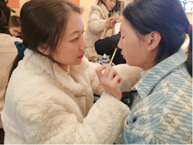 同學之間按照座位兩兩一組,一對一相互交流化妝技巧、互相化妝,整理儀容儀表。