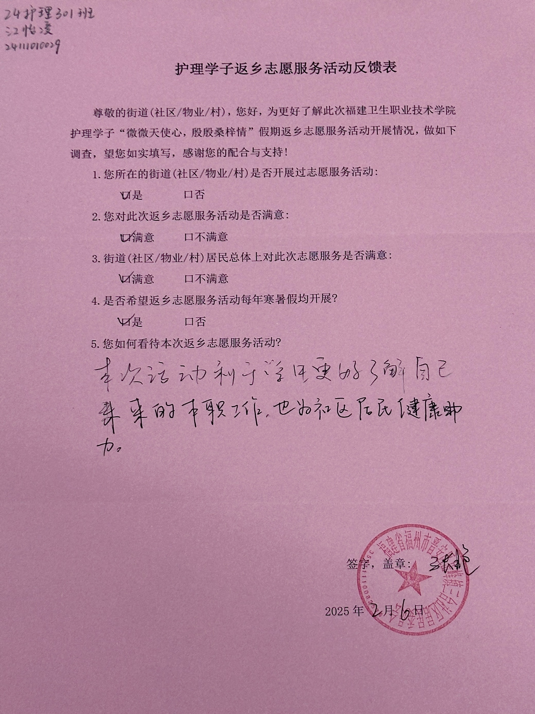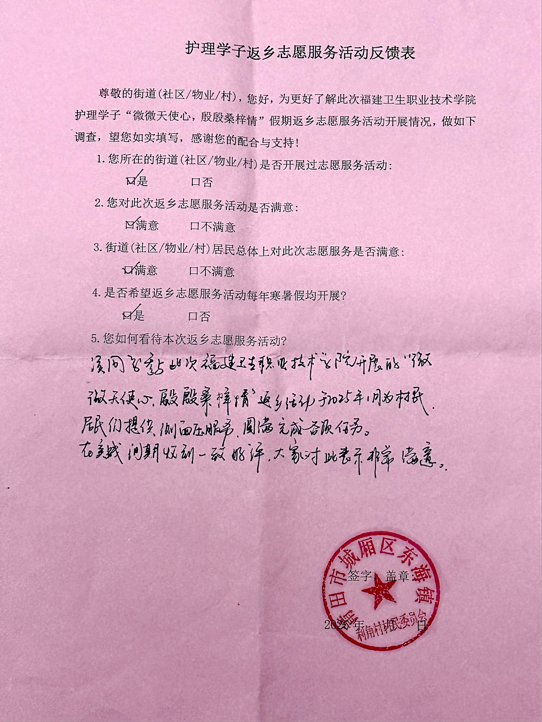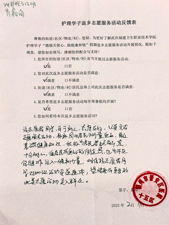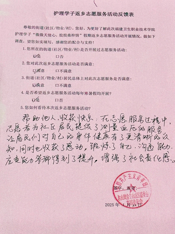 在這個(gè)寒冬里,護(hù)理學(xué)院學(xué)子帶著“微微天使心,殷殷桑梓情”來(lái)到大家身邊。一場(chǎng)義診活動(dòng),溫暖了整個(gè)社區(qū)。大家紛紛表達(dá)著感激。讓我們來(lái)翻閱鄉(xiāng)親們的反饋表,上面真誠(chéng)的文字,就像一面鏡子,映照出志愿者們的熱忱與付出,也見(jiàn)證著鄰里間因?yàn)檫@場(chǎng)活動(dòng)愈發(fā)緊密的情誼。每一張表,都是一份認(rèn)可,承載著鄉(xiāng)親對(duì)學(xué)子們深深的謝意。
