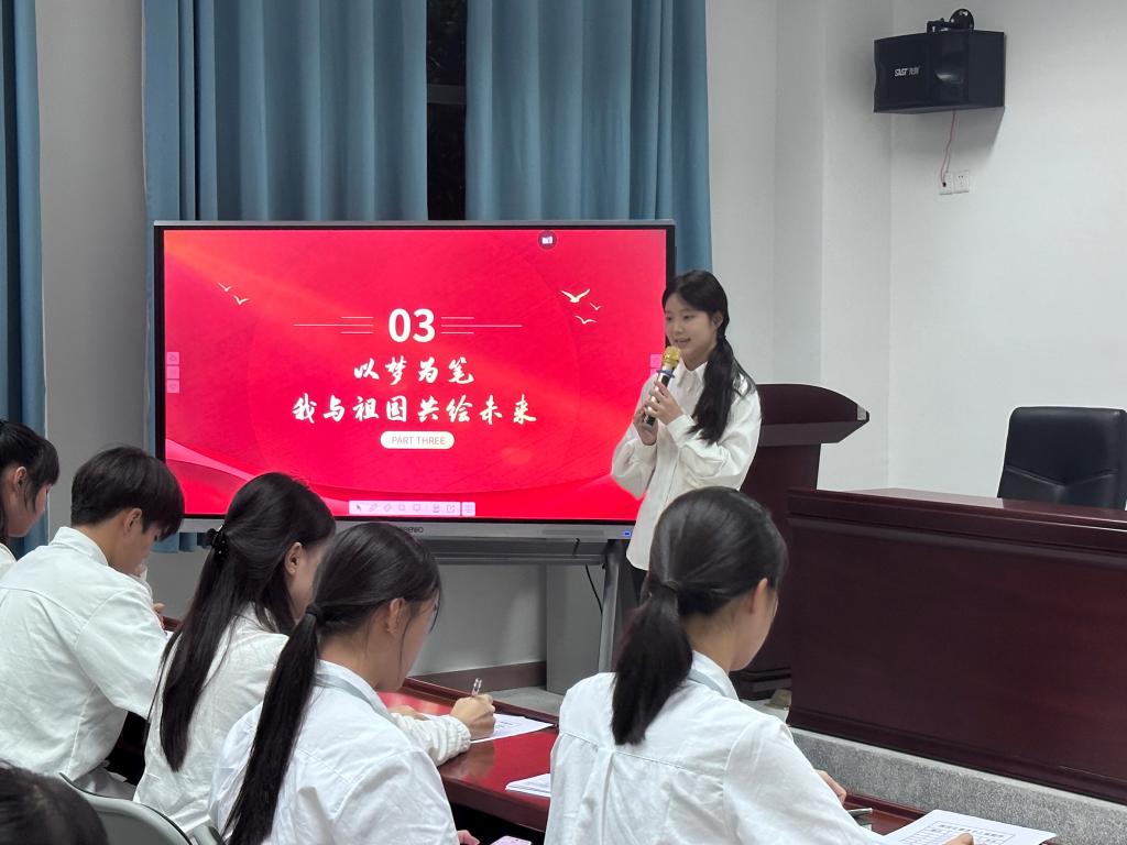 施琪同學(xué)回顧了祖國在革命戰(zhàn)爭年代的艱苦卓絕,歌頌了無數(shù)先烈們的英勇無畏;林燕萍同學(xué)描繪了祖國在建設(shè)時(shí)期的熱火朝天,贊美了勞動人民的勤勞智慧;吳嘉怡同學(xué)展示了祖國在新時(shí)代的蓬勃發(fā)展,抒發(fā)了對祖國未來的無限憧憬。