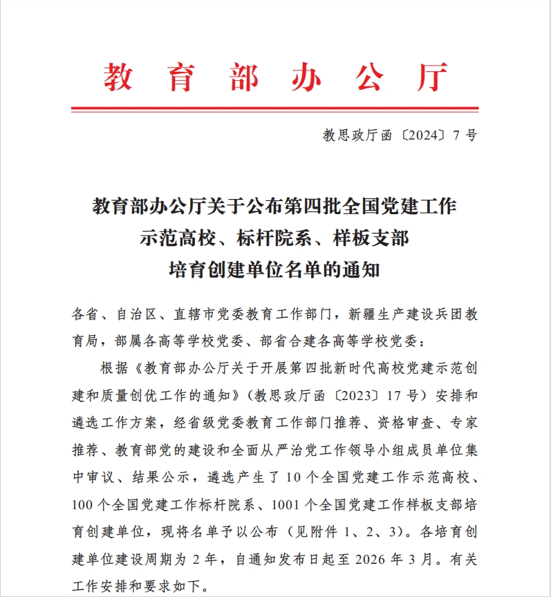 近日,教育部辦公廳公布第四批全國黨建工作示范高校、標桿院系、樣板支部培育創(chuàng)建單位名單,經(jīng)省級黨委教育工作部門推薦、資格審查、專家推薦、教育部黨的建設和全面從嚴治黨工作領導小組成員單位集中審議、結(jié)果公示,遴選產(chǎn)生了10個全國黨建工作示范高校、100 個全國黨建工作標桿院系、1001個全國黨建工作樣板支部培育創(chuàng)建單位。