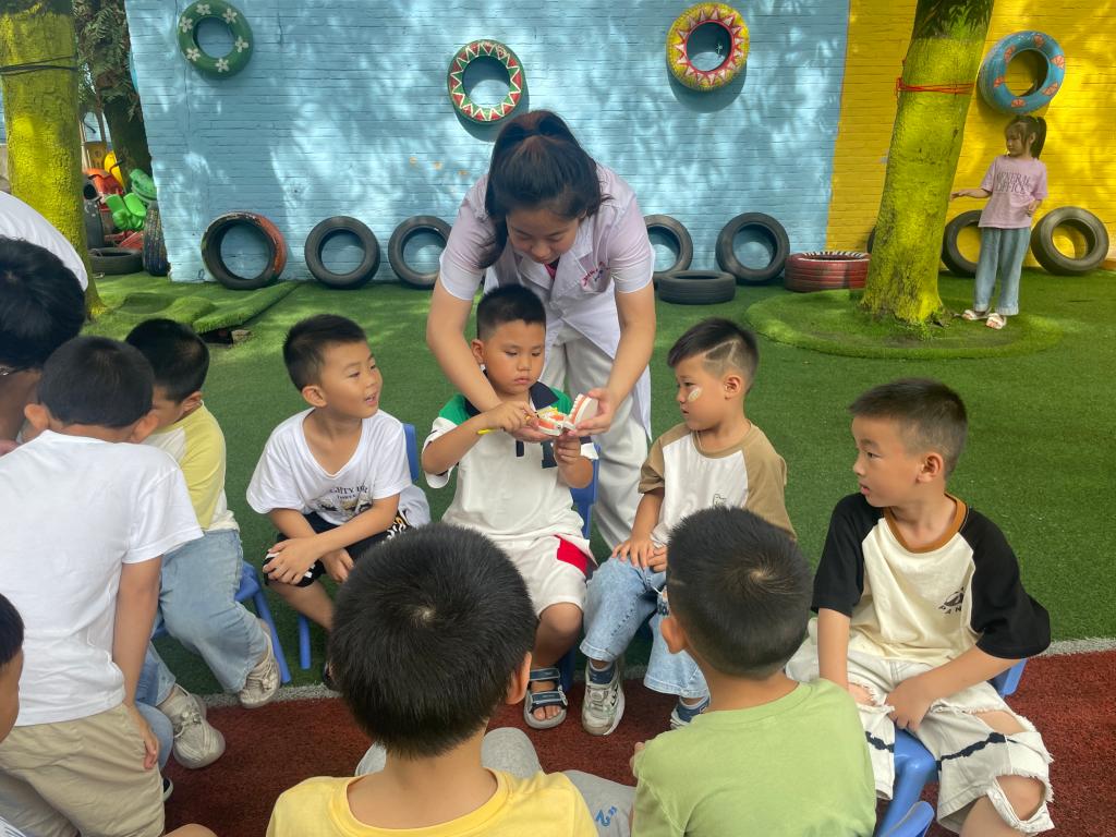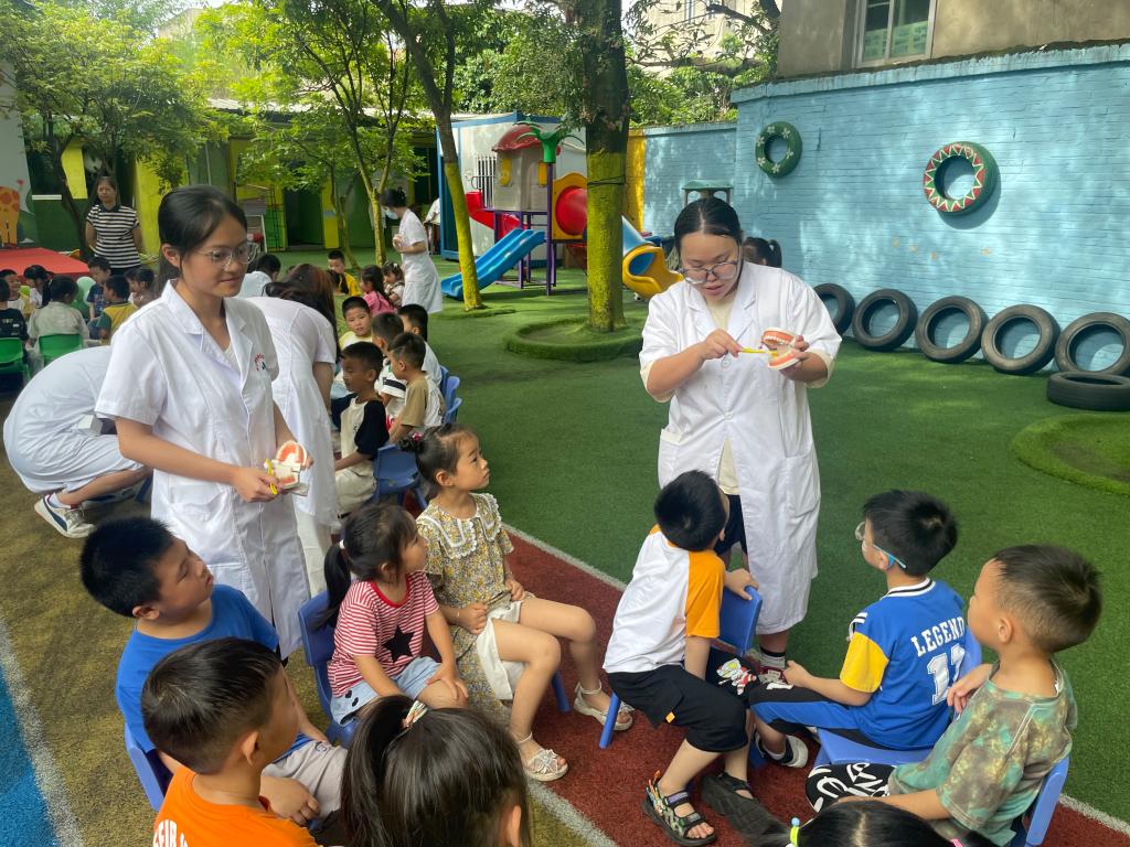 “牙伢衛(wèi)士”口腔志愿服務(wù)隊(duì)先為小朋友講解了什么是蟲牙、正確的刷牙方法和日??谇痪S護(hù)等科普知識(shí)。隨后,師生們給小朋友們做了細(xì)致的口腔檢查,并讓孩子們親手實(shí)踐正確的刷牙方法。在答疑環(huán)節(jié),志愿服務(wù)隊(duì)用孩子們能理解的語言耐心地對(duì)小朋友的提問一一作答,引導(dǎo)小朋友學(xué)會(huì)更好地照顧自己的牙齒。