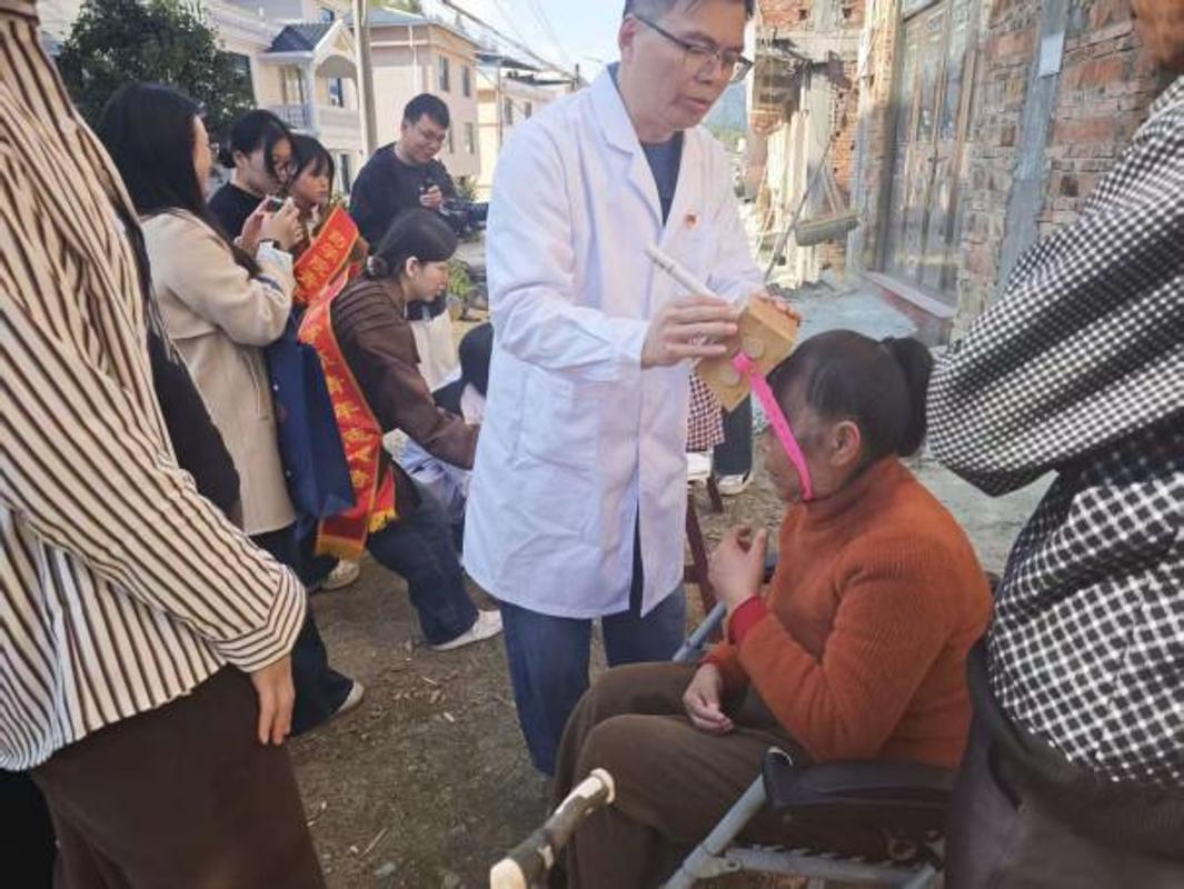 在廷坪鄉(xiāng)干部的帶領(lǐng)下,志愿服務(wù)團(tuán)隊(duì)首先前往玉洋村開展入戶中醫(yī)藥義診服務(wù)。玉洋村常住人口中60歲以上的老人占大多數(shù),屬于典型的“空心村”。他們大多年老體弱、行動不便,日常看病就醫(yī)存在諸多阻礙,這場上門服務(wù)給他們送去了愛心與溫暖。義診過程中,針對村民常見的頭部與肩頸不適、腿部疼痛等問題,通過辨證后,志愿團(tuán)隊(duì)為村民開展艾灸服務(wù),并同步進(jìn)行技術(shù)指導(dǎo),詳細(xì)講解居家艾灸的穴位選擇、操作方法與安全注意事項(xiàng),同時傳授康復(fù)養(yǎng)護(hù)要點(diǎn),幫助村民掌握日常緩解不適的技巧。此外,團(tuán)隊(duì)還指導(dǎo)村民正確使用中草藥泡腳液,說明使用頻率、水溫控制等細(xì)節(jié),并為每戶困難群眾送上“健康大禮包”,助力村民日常健康管理。