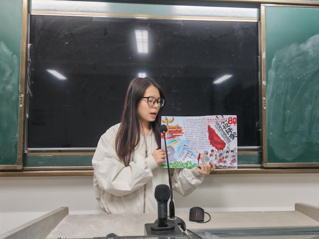 “紙承抗戰(zhàn)魂·手繪+精神譜系宣講”活動中,同學(xué)們以紙筆繪就精神圖景,以宣講傳遞紅色信仰:有人以紅楓為底繪楊靖宇身姿,有人定格沖鋒場景讓紅旗鮮活,有人書“日本投降矣”并附“以專業(yè)護(hù)安康”承諾,讓紅色教育從“被動接收”轉(zhuǎn)為“主動內(nèi)化”,讓抗戰(zhàn)精神沉淀為青年擔(dān)當(dāng)?shù)牡讱狻?/p>