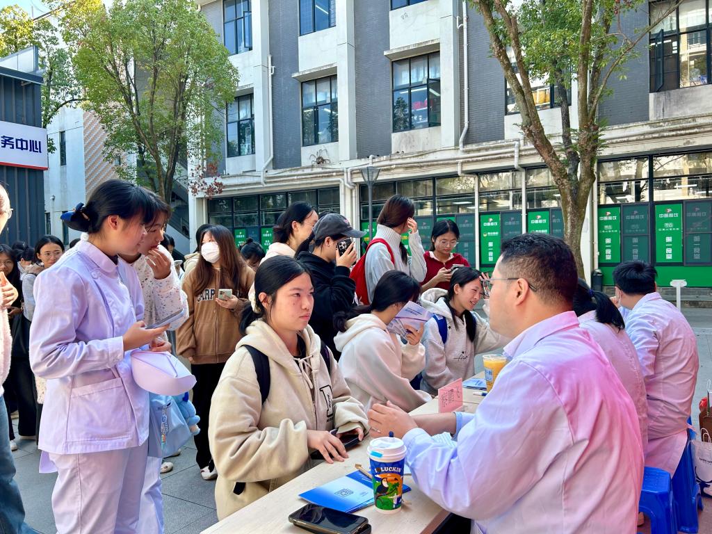 簽約儀式后,雙方黨支部在校園內(nèi)聯(lián)合舉辦“健康青春·戰(zhàn)痘行動”主題義診。此次義診活動聚焦青年師生常見皮膚問題,將臨床診療服務(wù)與藥學(xué)專業(yè)指導(dǎo)有機(jī)結(jié)合,既為師生提供了便捷、專業(yè)的健康服務(wù),也讓學(xué)生在實(shí)踐中深化了專業(yè)認(rèn)知,提升了理論聯(lián)系實(shí)際的能力?;顒蝇F(xiàn)場秩序井然、氛圍熱烈,得到了師生們的廣泛好評,彰顯了醫(yī)校雙方“以人民為中心”的服務(wù)理念和責(zé)任擔(dān)當(dāng)。